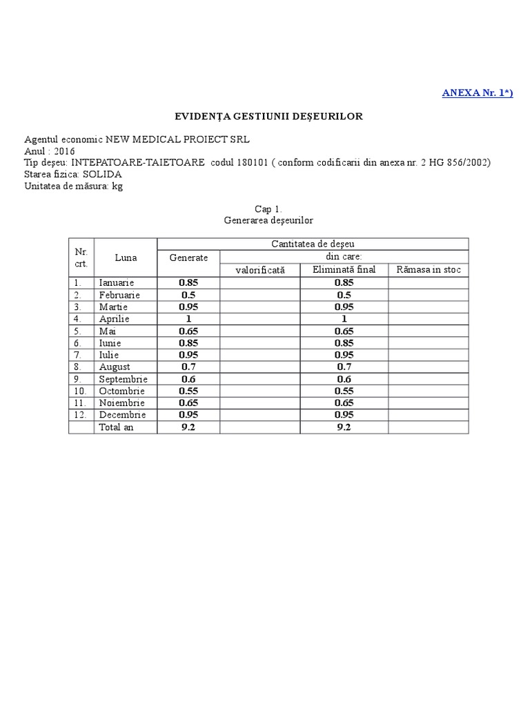 Registru Evidenta Deseuri Xls Document